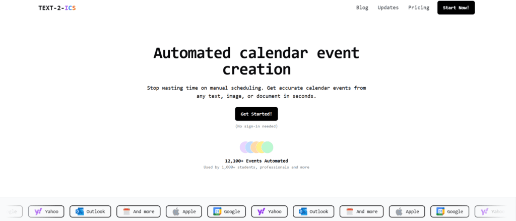 Text-2-ICS AI is the platform that converts text, documents, images, and PDFs into downloadable .ics calendar events. It eliminates the need for a manual schedule and extracts dates, times, and locations.